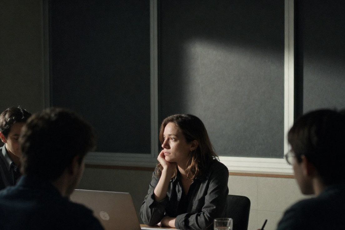 A woman sits at a table in a meeting room, resting her chin on her hand and looking thoughtfully to the side. She appears pensive or disengaged, while others around the table—slightly out of focus—look down at laptops or notes. Natural light from a window highlights her face, creating a quiet, reflective mood.